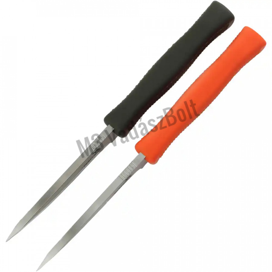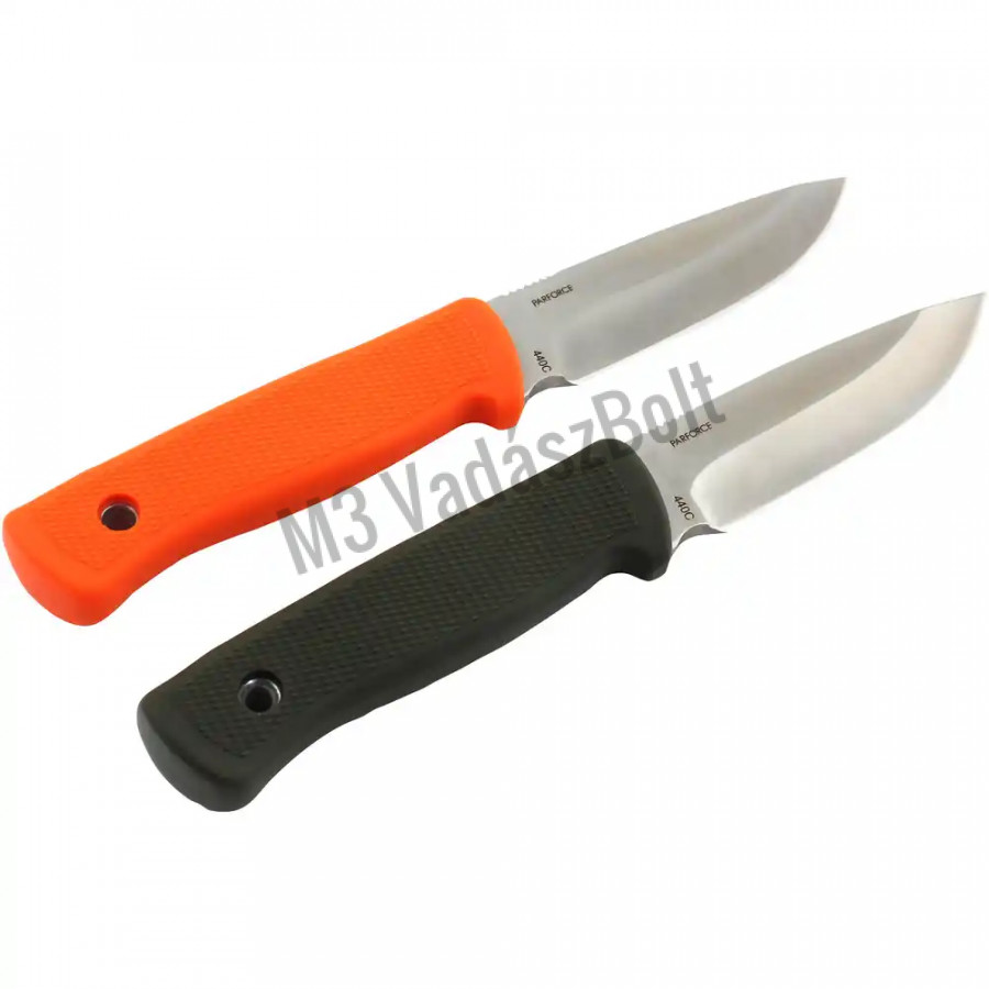 Nagyszerű késkészlet a PARFORCE-tól - két Full-Tang Field Pro vadászkéssel, olajbogyó és narancssárga nyéllel. A két vadászkés 4,5 mm vastag, szatén bevonatú pengével van felszerelve. Az erősen hullámos hüvelykujjtámasz lehetővé teszi a biztonságos, csúszásmentes munkavégzést. Az olíva vagy narancssárga színű gumi markolat halbőr megjelenésű bordázattal rendelkezik, és nagyon jó fogást biztosít a legkülönbözőbb feladatokhoz - még nedves kézzel is. A zsinórnyílás lehetővé teszi a zsinór rögzítését. A szett tartalmaz két valódi bőrből készült övtokot is. Az egyik bőrtok fekete bőrből készült és narancssárga kontrasztvarrással, a másik pedig barna bőrből készült, tónus-tónus varrással. A késeket díszdobozban szállítjuk.