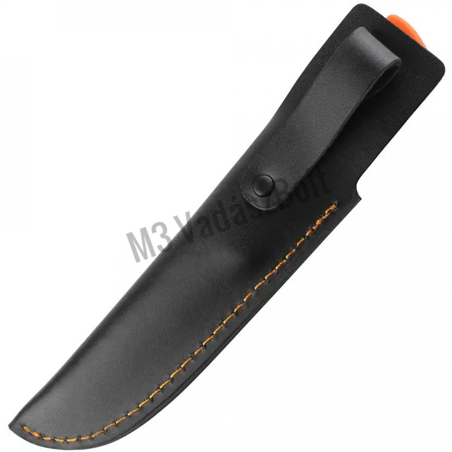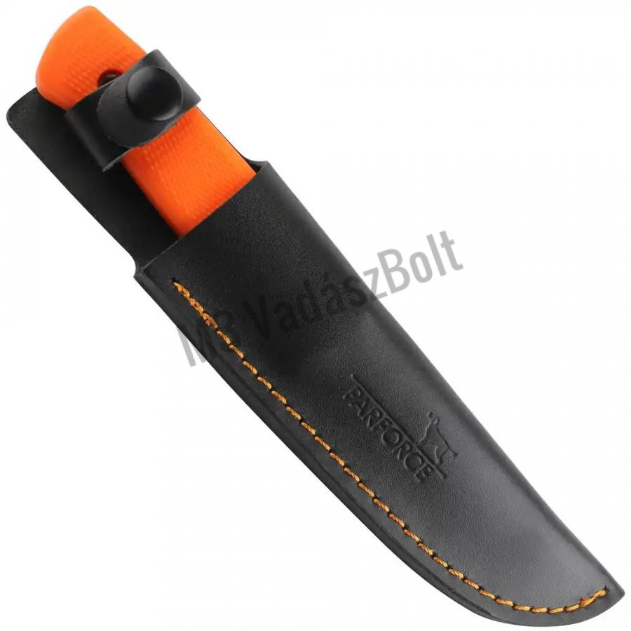 A Parforce Hunter Pro vadászkés megbízható, precíz és masszív eszköz, amely ideális társ minden vadász számára. A kés 10 cm hosszú, szaténfelületű pengéje 440C rozsdamentes acélból készült, amely kiváló él­tartást és vágási teljesítményt biztosít. A 4,9 mm vastag, teljes tangos (full tang) kialakítás nagyfokú stabilitást és tartósságot garantál, így a kés intenzív használatra is alkalmas. A penge erősen bordázott hüvelykujjtámaszt kapott, amely biztos fogást és csúszásmentes munkavégzést tesz lehetővé. A kés markolata ergonomikus formájú, csúszásmentes gumibevonattal készül, élénk jelzőnarancs színben, ami rossz fényviszonyok mellett is könnyen észrevehetővé teszi. A halpikkely-mintás textúrájú felület nedves körülmények között is stabil fogást nyújt. A markolat végén található fangriemen-gyűrű lehetővé teszi egy csuklópánt rögzítését, így a kés mindig kéznél tartható. A Hunter Pro vadászkéshez elegáns, valódi bőrből készült barna övtok tartozik, amelyet biztonsági nyomógombbal láttak el a kés rögzítéséhez. A mindössze 160 grammos súly könnyű hordozhatóságot biztosít, így a kés nemcsak megbízható munkaeszköz, hanem stílusos kiegészítő is egyben.