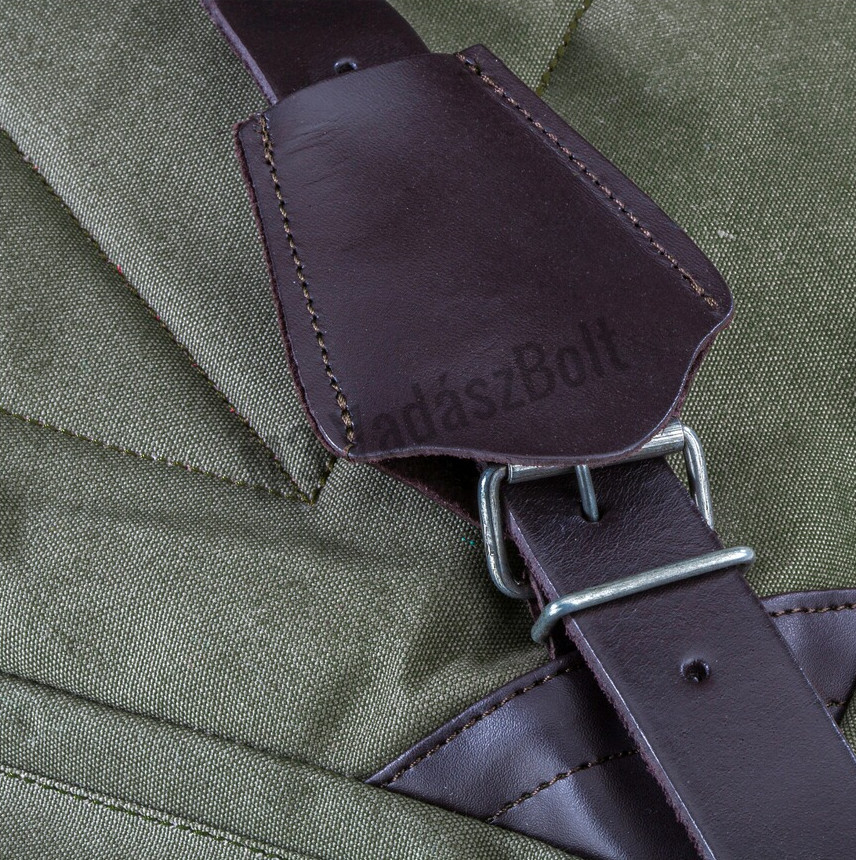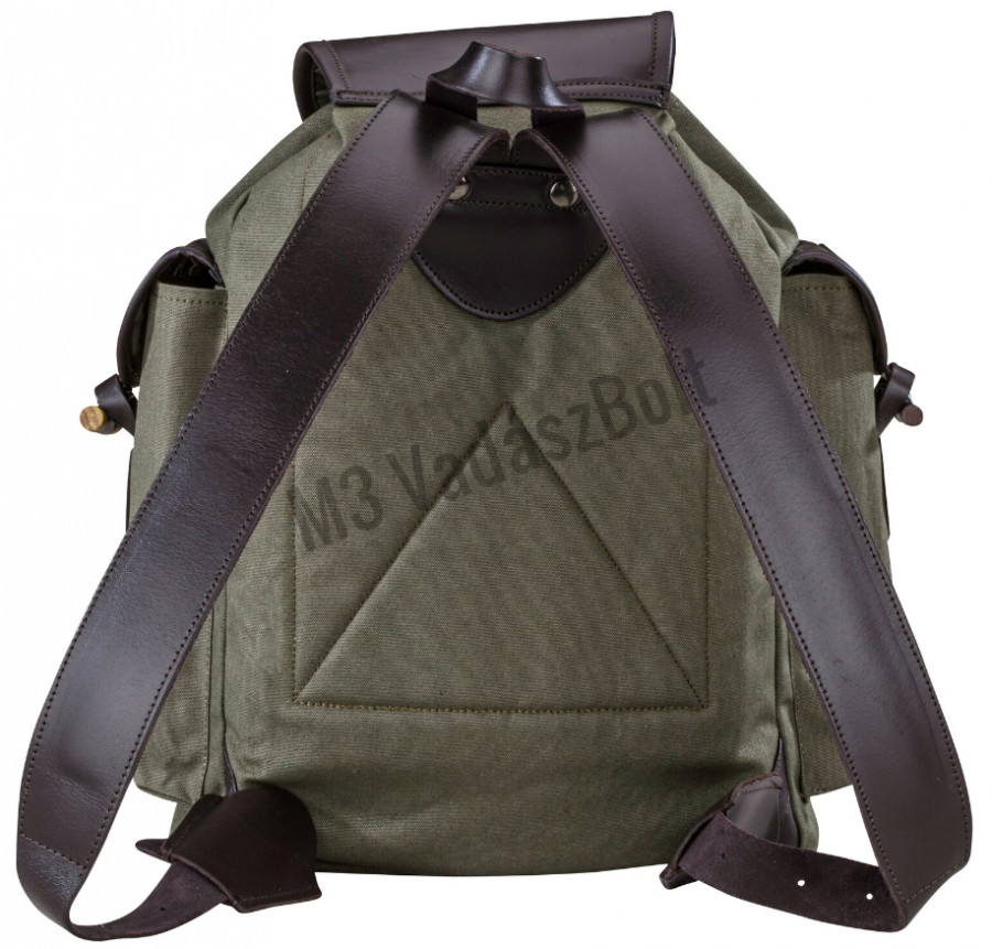 Erős vászonból készült, bőrrészekkel kiegészített, strapabíró, csendes vadászhátizsák párnázott vállszíjakkal.