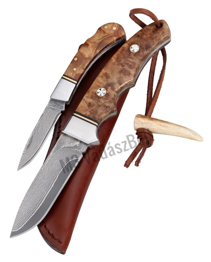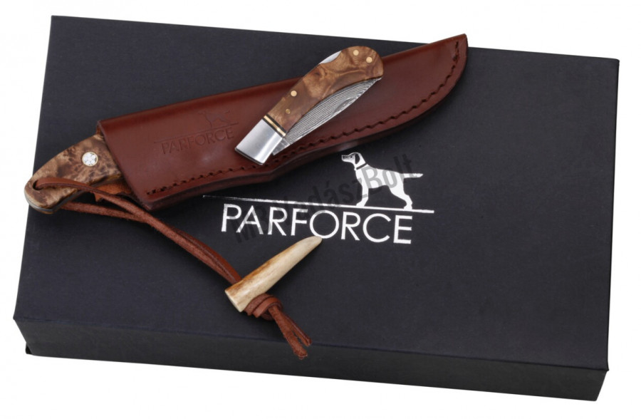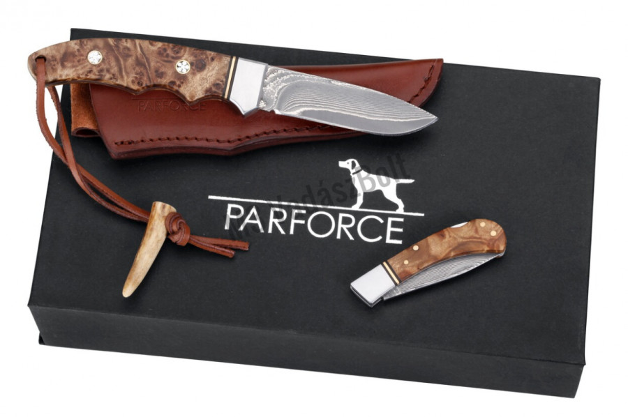 PARFORCE damaszkuszi pengés tőr és bicska díszdobozban. A gyönyörű pengéket kiegészíti az elegáns, mintás famarkolat, a mozaik szegek és a több rétegből összerakott ujjvédő. A tőr pengéje 9 cm hosszú, teljes hossza 20.3 cm és bőrtokkal rendelkezik. A bicska követi a tőr szépségét, pengehossza 6.3 cm, teljes hossza pedig 13.7 cm. A pengéjét egy hátsó rögzítés tartja biztosan a helyén.