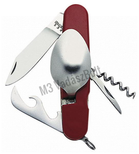 Piknik készlet, mely a műanyag markolatnál ketté választható a kényelmes tartás érdekében. Tartalmaz: kést, villát, kanalat, dugóhúzót, konzerv és sörnyitót, valamint bőrvarrót. Kulcskarika segítségével övbújtatóhoz is csatlakoztatható.