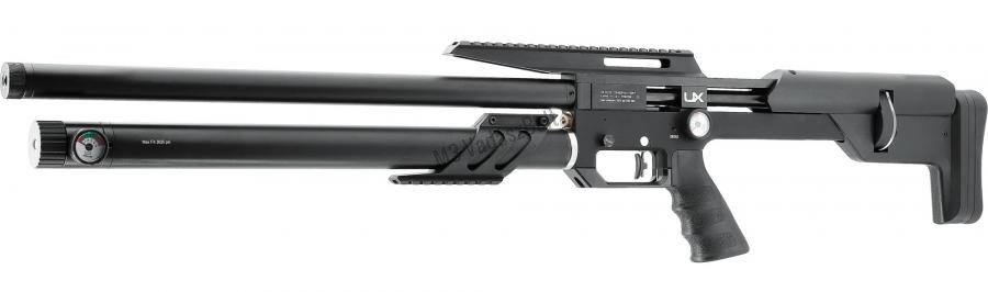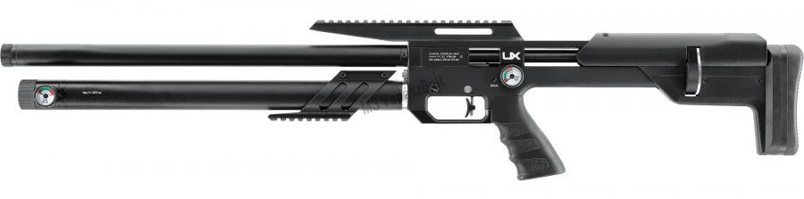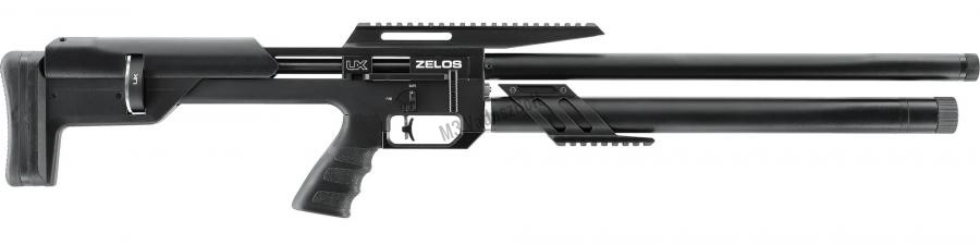 Az UX Zelos egy ultrakompakt egyeneshúzású bullpup pcp légpuska, amely kényelmes méretben kínál teljes funkcionalitást. A 24 lövedékes, 4,5 mm-es (.177) forgótár az elsütőbillentyű mögött, az arctámasz vonalában helyezkedik el, így egy 680 mm hosszú huzagolt cső fér el a mindössze 930 mm-es fegyverházban. A CNC-megmunkált alumínium váz minimalista kialakítása révén a Zelos súlya 3.400 g alatt marad. A beépített sűrített levegős tartály a cső alatt szabadon fut, nyomásmérővel rendelkezik, valamint a rajta lévő Picatinny sín lehetőséget biztosít kiegészítők felszerelésére. A maximális töltési nyomás 3.625 psi / 250 bar.