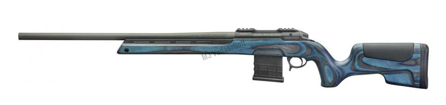 laminált fa alapanyag kék és szürke színárnyalatban, pisztolymarkolattal, állítható pofadarabbal, tusgumival, fenéklemez és egy beágyazottt M-Lock sín az a fa alatt.