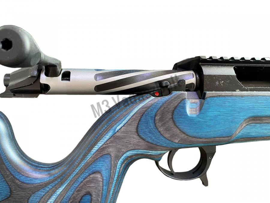 laminált fa alapanyag kék és szürke színárnyalatban, pisztolymarkolattal, állítható pofadarabbal, tusgumival, fenéklemez és egy beágyazottt M-Lock sín az a fa alatt.