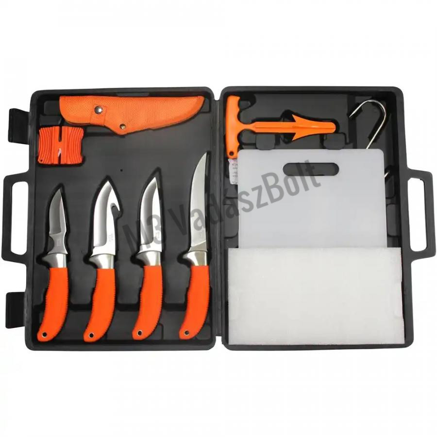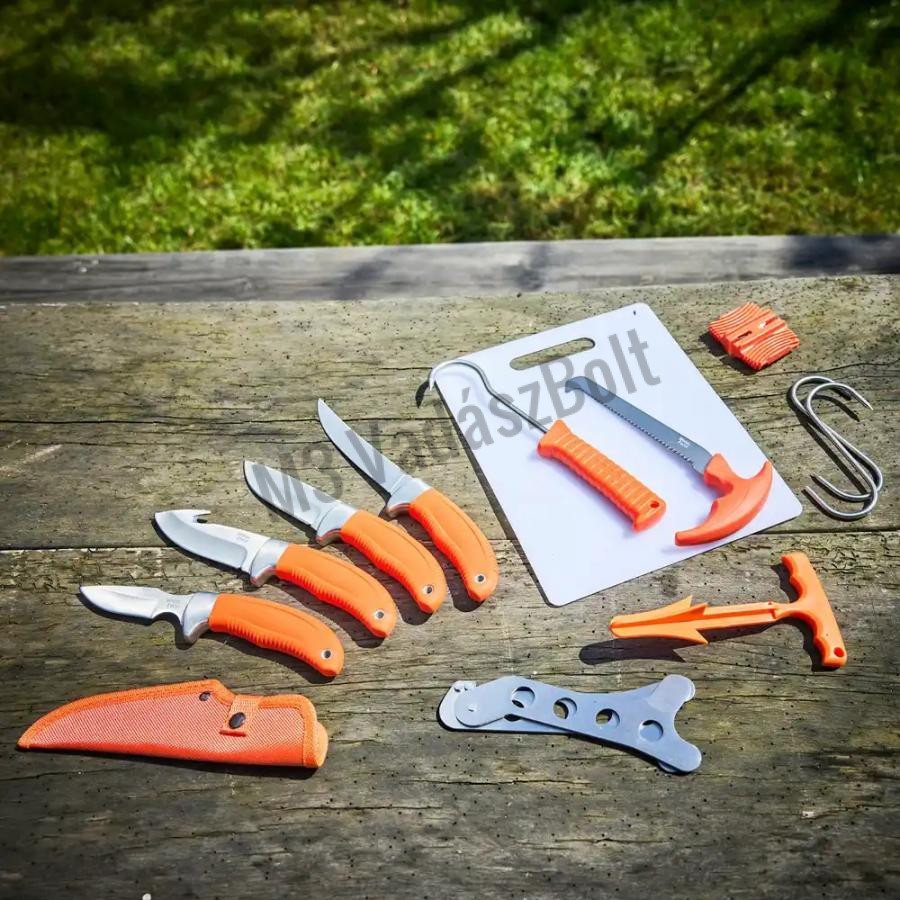 A Wald&Forst 13 részes zsigerelő és vadfeldolgozó szett egy professzionális minőségű, komplett készlet, amely minden szükséges eszközt tartalmaz a vad szakszerű feldolgozásához. A kések és a bontófűrész pengéi rozsdamentes 420-as acélból készülnek, ami hosszú élettartamot és megbízható teljesítményt garantál még intenzív használat mellett is. A higiénikus, TPR-bevonatú markolatok csúszásmentes fogást biztosítanak, így nedves körülmények között is stabil, biztonságos munkavégzést tesznek lehetővé. A markolatokon található fangriemen-gyűrűk tovább növelik a kezelhetőséget. A szett átgondolt kialakítása megkönnyíti a vadbontást: a kicsontozó kés, vadászkés, nyúzókés, filézőkés, bontófűrész, Wildspreizer, bontóhorgok, S-alakú akasztók, Waidlochauslöser, műanyag vágódeszka és élező mind a hatékony munkát szolgálják. A készlet része egy nylon kés-tok, valamint egy masszív, jól rendszerezhető műanyag koffer is, amely megkönnyíti az eszközök biztonságos szállítását és tárolását. A Wald&Forst Zerwirk-Set Big Box ideális választás vadászoknak és mindenkinek, aki professzionális és higiénikus módon szeretné feldolgozni a vadat.