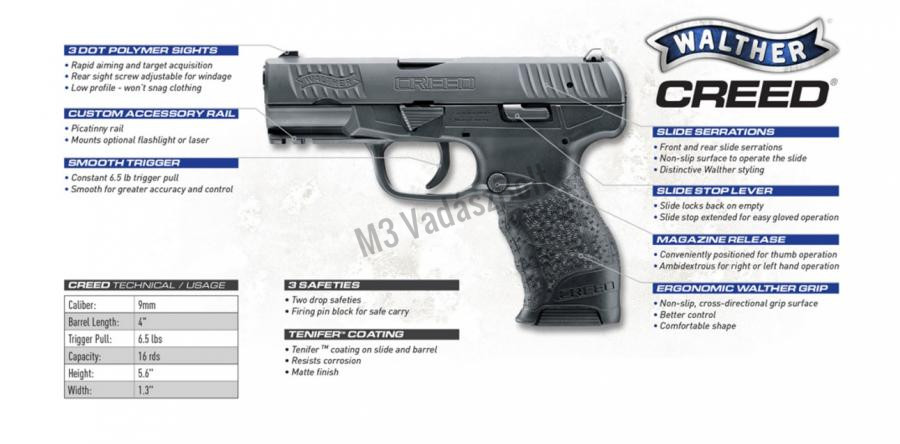 A Walther Creed egy modern, megbízható és könnyen kezelhető pisztoly. A pisztoly 9x19 mm kaliberű, 4" fegyvercsőhosszúsággal rendelkezik. A Creed tervezésekor elsődleges szempont volt a felhasználóbarát és kényelmes kezelés, valamint a megbízhatóság. A Creed kialakításának része egy ergonomikus markolat, mely kényelmes fogást biztosít a felhasználó számára. Az ütésbiztos műanyag markolat anyaga rendkívül strapabíró, így hosszú élettartammal rendelkezik. Az integrált ravaszbiztos kapcsoló és biztonsági sín a kényelmes és biztonságos kezelést szolgálja.