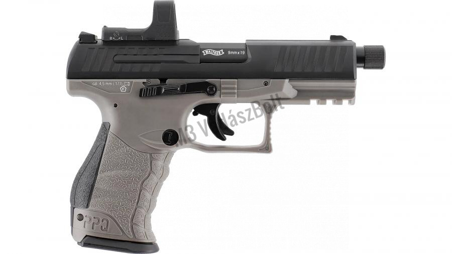 A Walther PPQ félautomata működésű, CO2 gázzal működő lánctáras légpisztoly. Forgótár kapott helyet a pisztolyban, amelybe 21db 4,5mm pellet tölthető be. A hagyományos ólom lövedéknek és a huzagolt csőnek köszönhetően pontlövésre is remekül használható, kiemelkedő pontossága miatt. A 4,6" hosszú csővel kombinálva a pelletek lényegesen nagyobb röppálya-stabilitást és nagyobb pontosságot garantálnak az acél BB-kkel összehasonlítva. Ezen kívül a hátsó irányzék szélirányban állítható. Gyakorlásra is kiválóan alkalmas. Taktikai kiegészítők is felszerelhetők a pisztolyra a cső alatt kialakított sínnek köszönhetően. A beépített pontirányzékkal ellátott fém szán alatt található a csővégi menet (M14x1 bal) fejbiztosító anyával a hangtompító vagy kompenzátor felszereléséhez. Ebben a szettben a fegyver mellé kapunk az Umarextől egy RDS8 RedDOT is, melyhez egy fedőlemez is tartozik a felszereléshez. A Picatinny sín teszi teljessé a kiegészítő pontok sorát. Ezenkívül a tártartó balról jobbra alakítható. Éles változata igen elterjedt, rendvédelmi, biztonsági szervek előszeretettel használják megbízhatósága miatt. Igazi Walther minőség. A légpisztoly tökéletes mása éles testvérének.