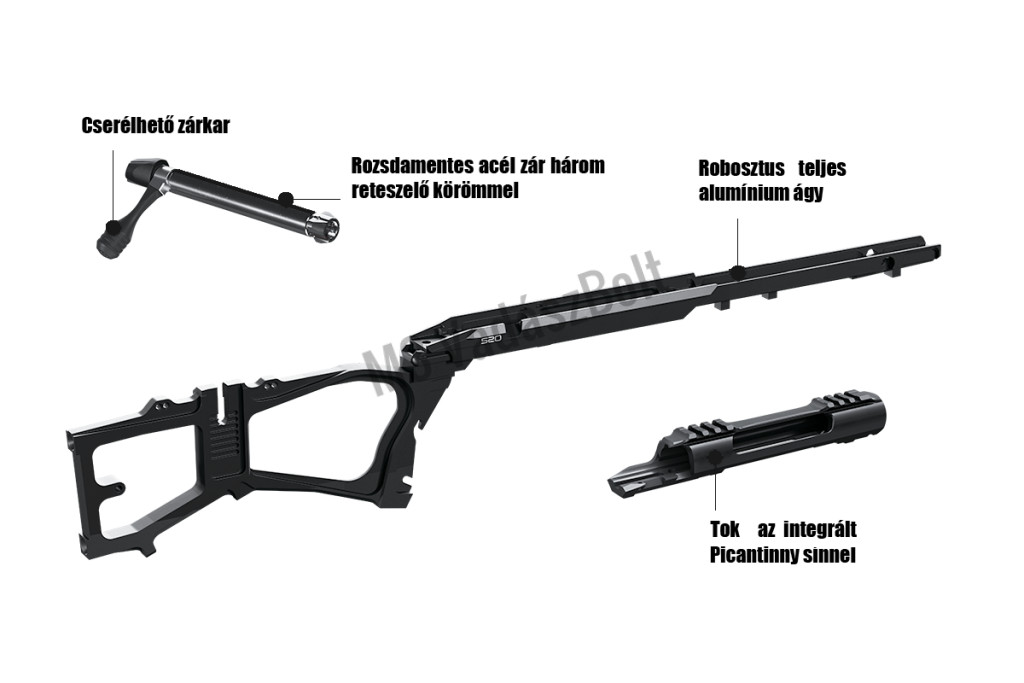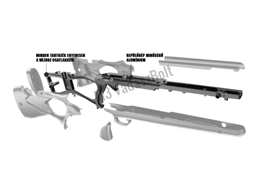 A fegyver szintetikus tussal kapható csak (a belsejében alumínium vázzal), a markolatnál pedig bőrhatású gumírozást kapott. A pofadékmagasság és a tushossz állítható. Az alján egy M-LOK nevű csatlakozó található, ahová kiegészítőket rögzíthetünk, például egy kifordítható monopodot, ami elülső bipod használata esetén hátul tudja feltámasztani a puskát.