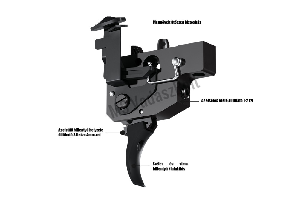 A fegyver forgó-tolózáras, az elsütőszerkezeten pedig nem csak a sütés érzékenységét tudjuk állítani, hanem az elsütőbillentyű pozícióját is. A Sako leírása szerint a sütés opcionálisan kétfázisú is lehet. Ellentétben az egyfázisú elsütéssel, ahol folyamatos nyomást eszközöl a vadász az elsütőbillentyűre addig, amíg a fegyver el nem sül, a Sako S20 kétlépéses sütése úgy működik, hogy a billentyűt részben meg kell húzni, amíg egy “falnak” nem ütközik. Innentől már sokkal kisebb erővel kell húzni az elsütéshez. Ez kisebb bemozdulást generál, miután a teljes húzóerő kifejtésének jórésze már az első fázisban megtörténik.