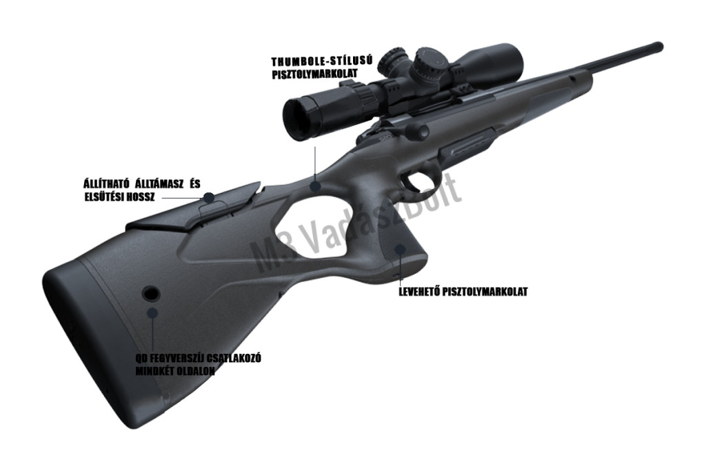 A fegyver szintetikus tussal kapható csak (a belsejében alumínium vázzal), a markolatnál pedig bőrhatású gumírozást kapott. A pofadékmagasság és a tushossz állítható. Az alján egy M-LOK nevű csatlakozó található, ahová kiegészítőket rögzíthetünk, például egy kifordítható monopodot, ami elülső bipod használata esetén hátul tudja feltámasztani a puskát.