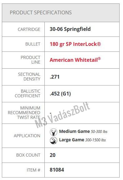 30-06Spr. SP Interlock American Whitetail - A széria, ami kimondottan nagytestű vad meglövésére készült. A nagy távolságokon is kitűnően teljesítő White Tail a szarvasvadászidény pótolhatatlan kelléke. A gyártó tradicionális ólomhegyű lövedékkel látta el a lőszert. Kialakítása és anyagminősége egyenletes gombásodást és erős becsapódási energiát tesz lehetővé. A Hornady InterLock technológiának köszönhetően a lövedék köpenye és magja tökéletesen záródnak egymáshoz, így közvetítve tökéletesen minden energiát a becsapódás és a gombásodás során.
