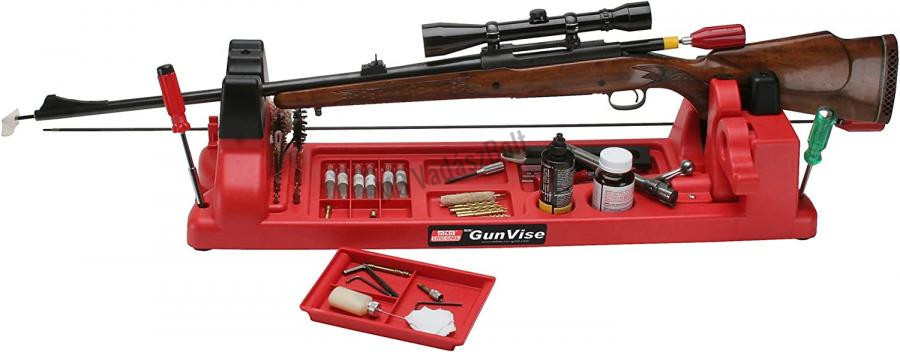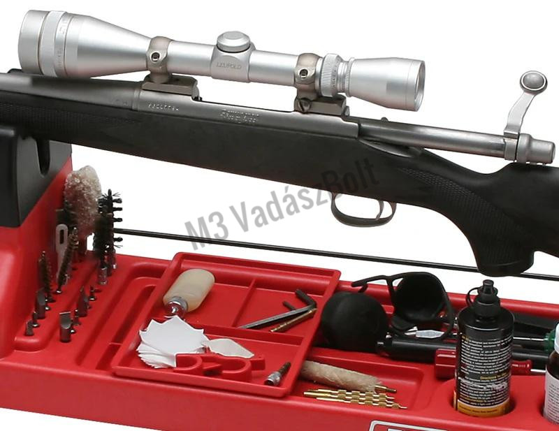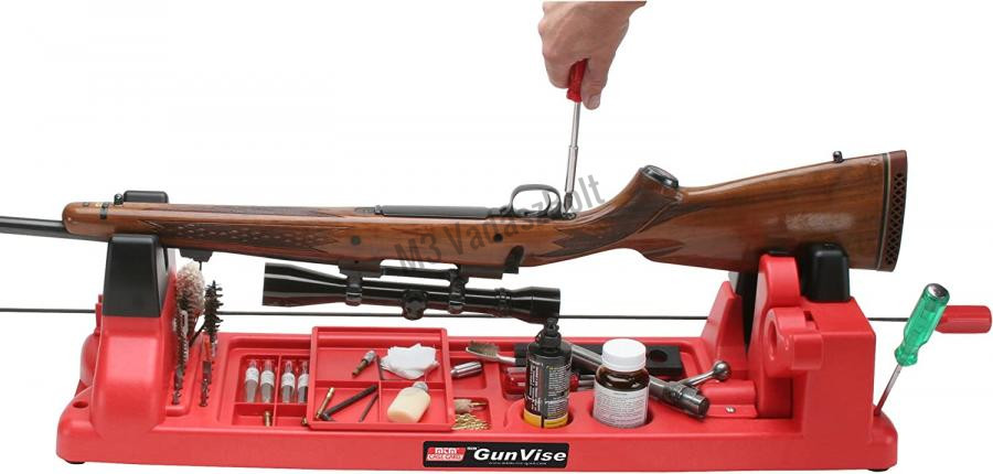 Az MTM Gun Vise-t úgy tervezték, hogy a lőfegyverek széles skáláját befogadja a fegyvertisztításhoz, karbantartáshoz vagy fegyverkészítéshez. Puskákhoz és sörétes puskákhoz használható. Minden feltámasztási vagy érintkezési pontja gumírozott, hogy megvédje a fegyverek kényes részeit. A szorító mögötti második villa a fegyverek tisztításának megkönnyítésére szolgál, hogy a tisztításhoz megfelelő szögben álljon. Az alapban lévő 11 rekesz használható a fegyver alkatrészeinek szétválasztására vagy bármi másra, amit csak akar. Az egy darabból álló, 21 darabos csavarhúzó-bit tartó ugyanúgy alkalmas a fogókhoz és kefékhez, mint a bitekhez. A masszív, vegyszer- és oldószerálló polipropilén műanyagból készült MTM Gun Vise tartósnak készült, hogy hosszú időn keresztül, nagy megelégedéssel használhatssa.